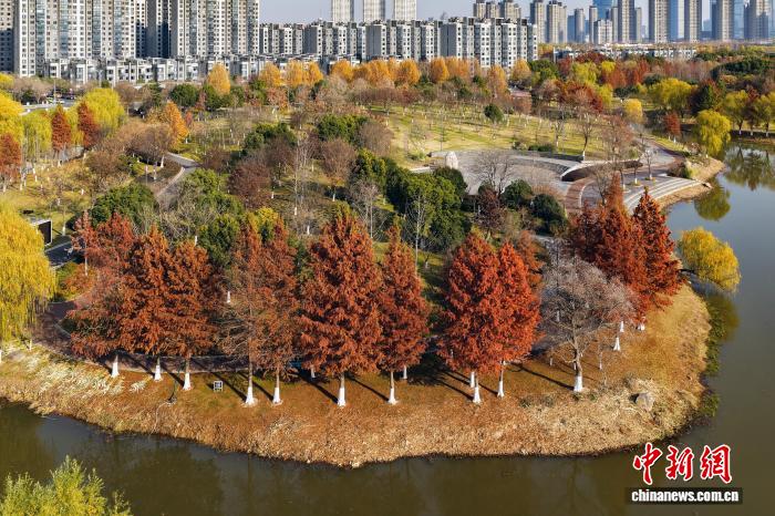 12月16日,航拍位于少江中的北京市修邺区江心洲青奥丛林花园,天然肌理取乡市天空线相照应,“画便”冬季里的死态图景。(无人机像片)中新社记者 泱波 摄